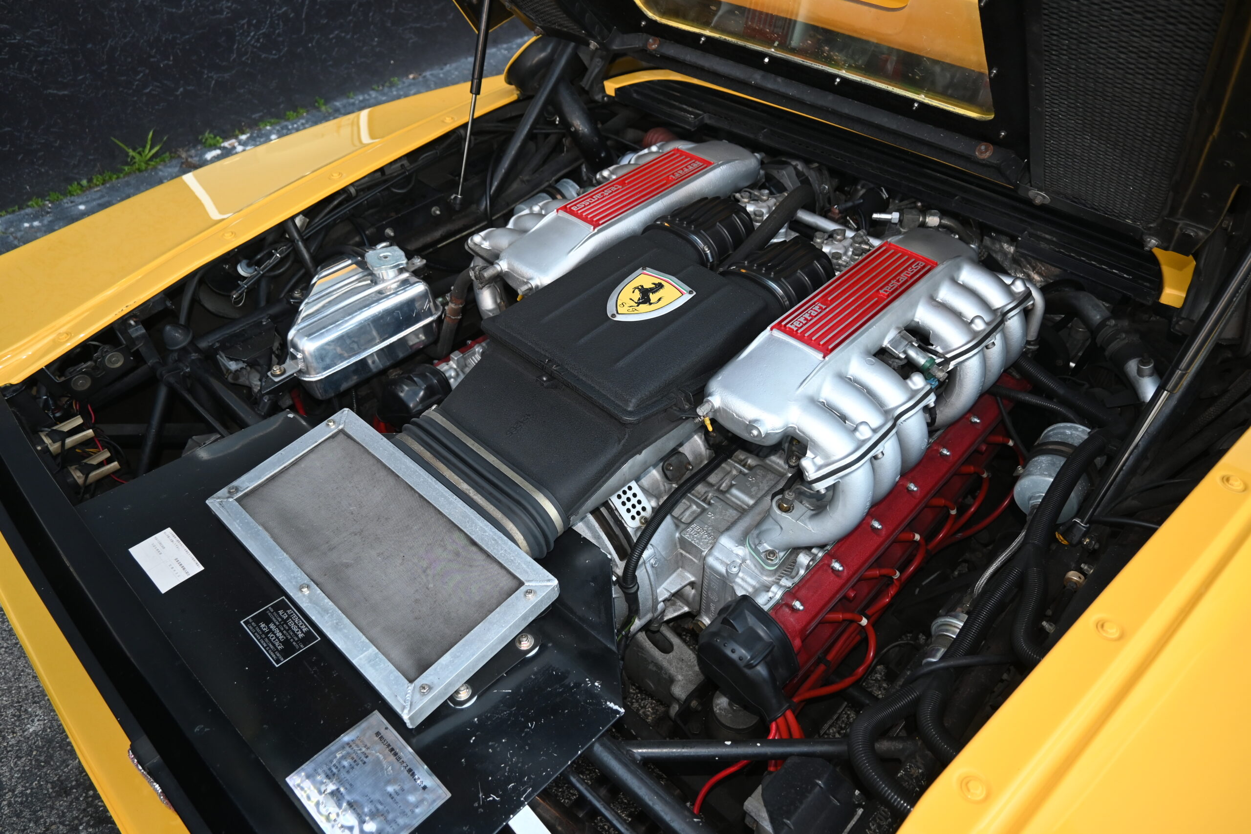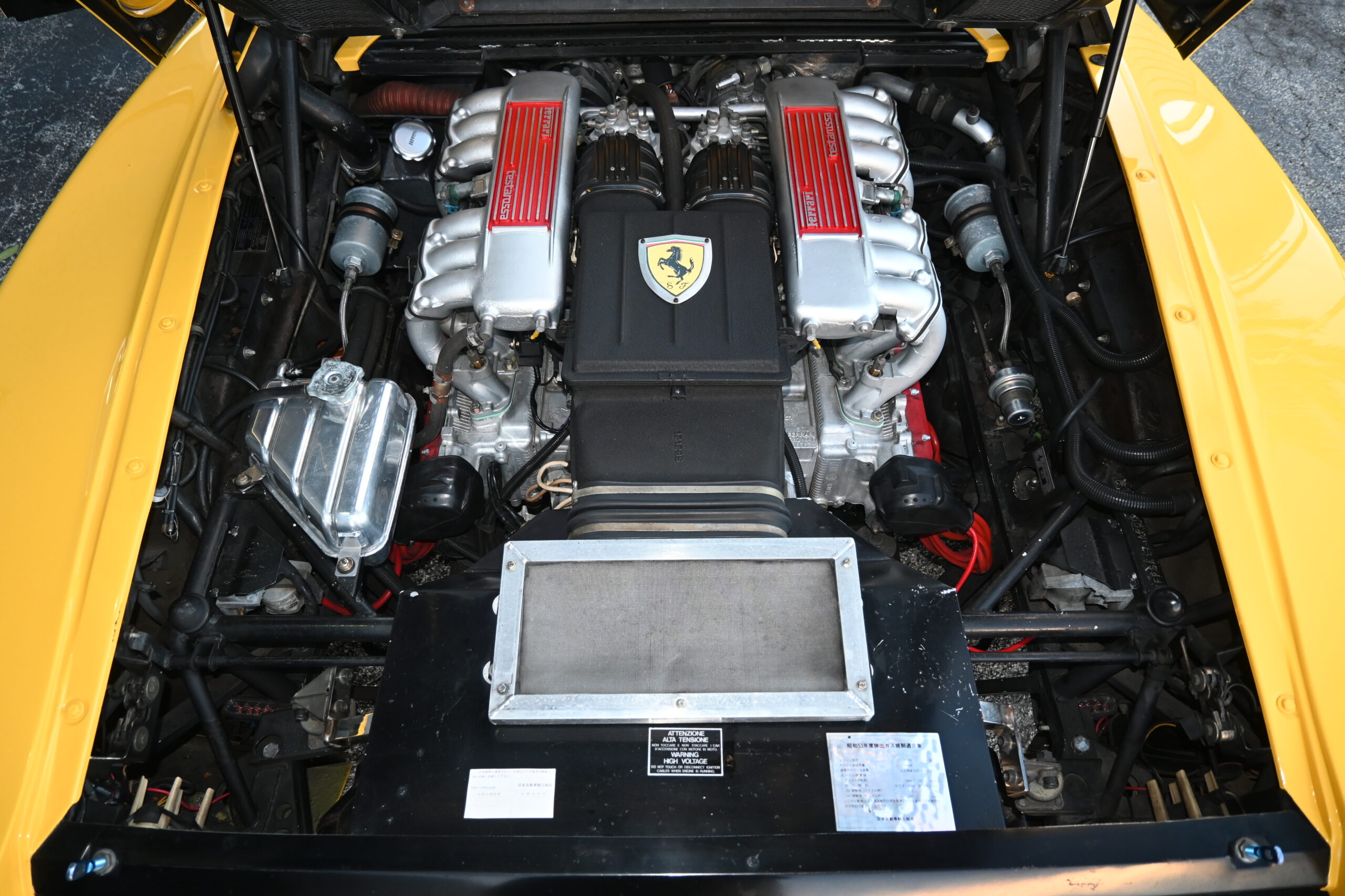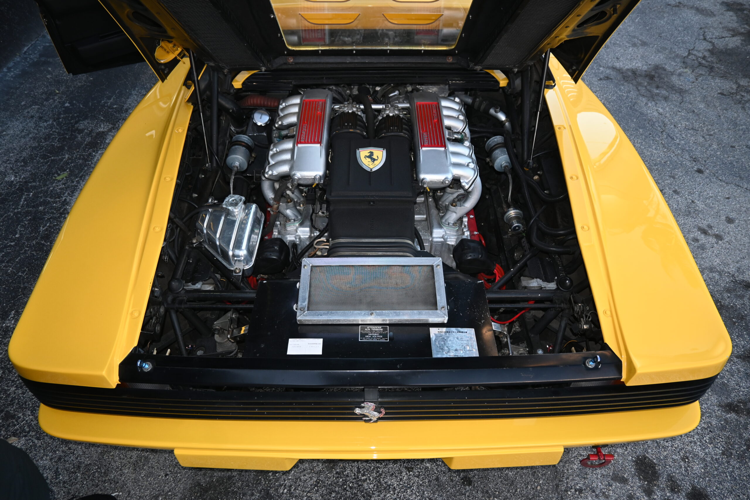 The bright and originally Giallo yellow exterior stands out day and night… Delivered new to CORNES Japan it presents like a very low mileage car aided by a few exterior accents that aren’t commonly found on the average TR but add tons of character to the original Pininfarina design. To start, two of the aerodynamic streaks have been deleted on both doors leaving only three per side – creating large, defined openings to the air inlets. The front end is mostly factory but all bulbs have been replaced with white LED including the fully functional pop-up headlamps and fog lights. On the rear end you’ll find a custom Koenig single-element wing with custom carbon adjustable mounting stays to the rear engine cover and supporting rods on the backside. A six-tip custom exhaust, which is also illuminated by red LED’s inside the engine compartment pokes from underneath the rear bumper. The cherry on top? A bedazzled prancing horse… signature Japan. Overall the exterior presents amazingly well. Free of any major rock chips/scratches or dents and functional lighting.