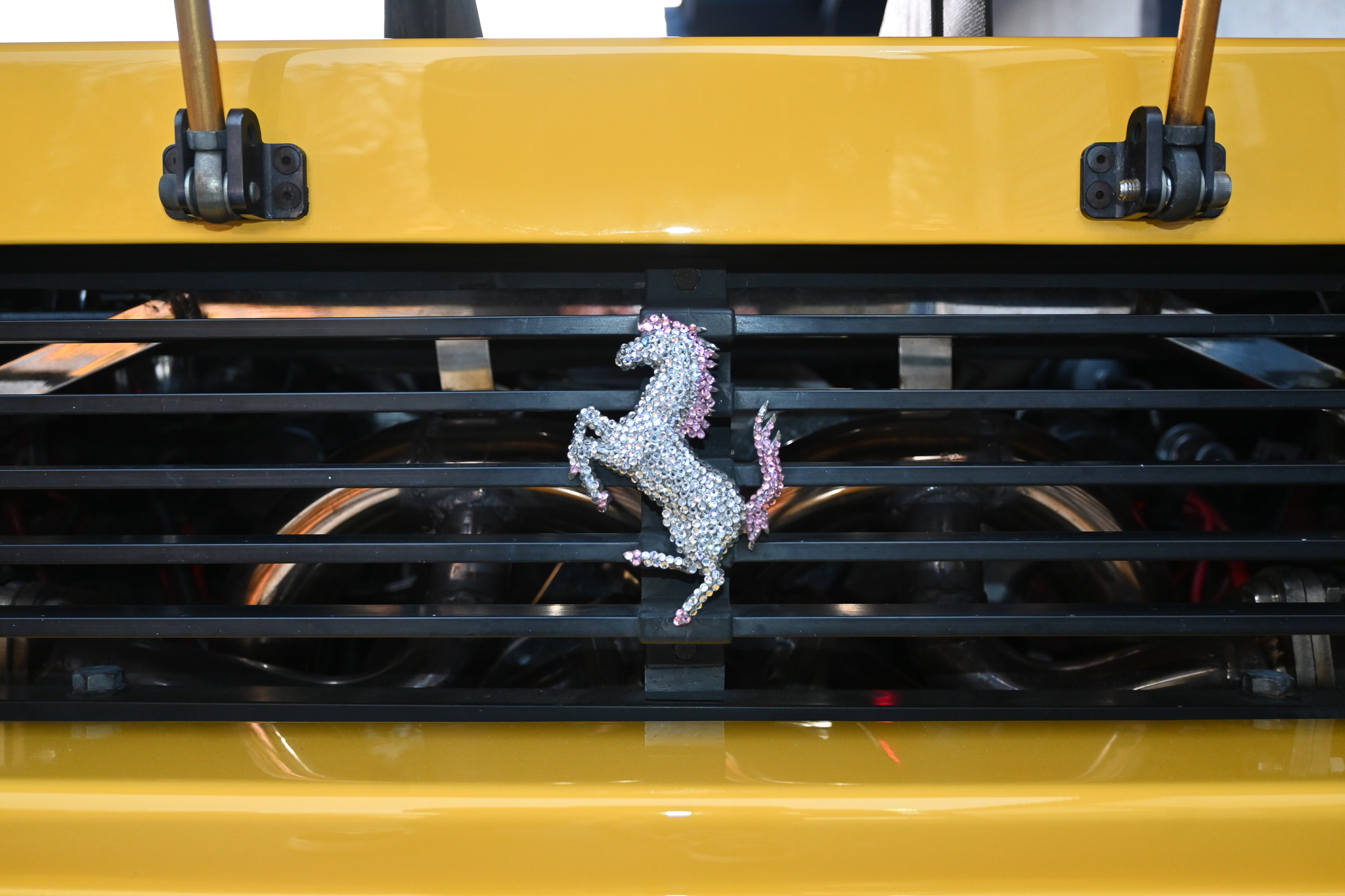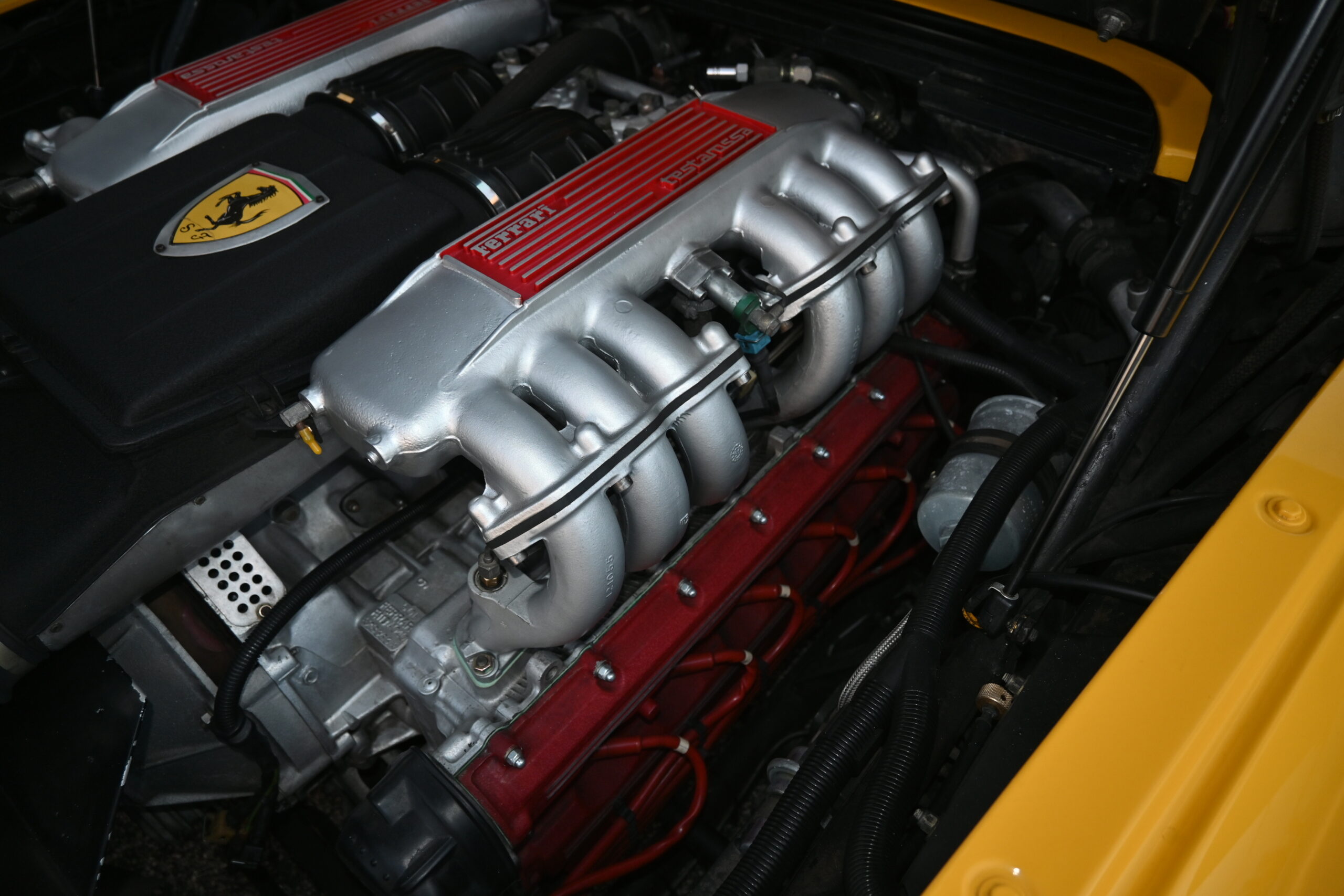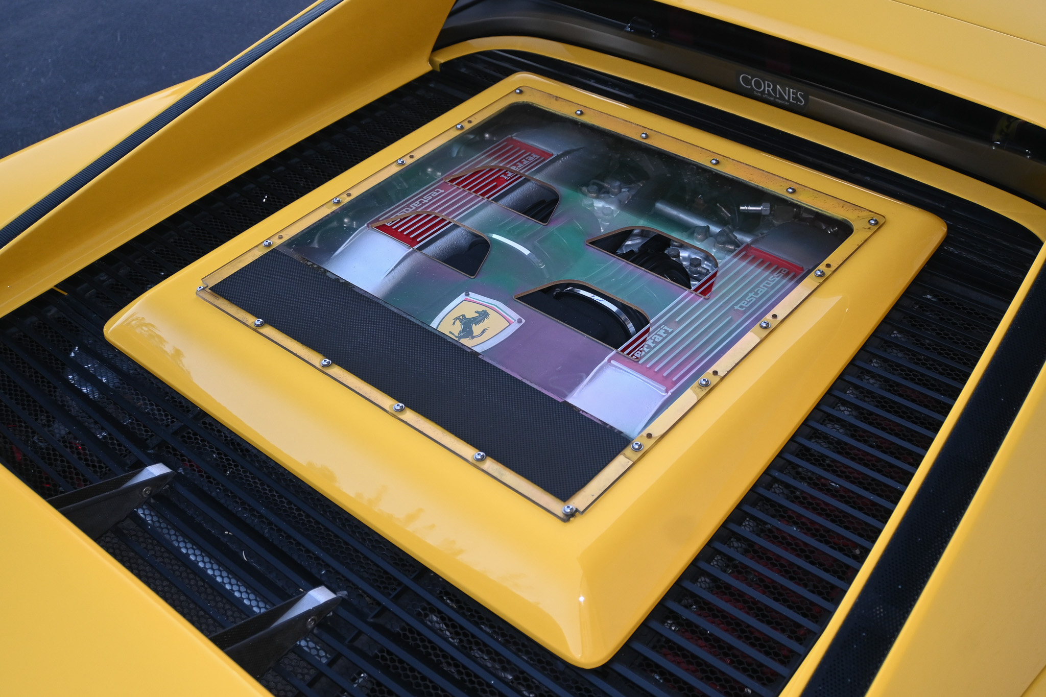 The bright and originally Giallo yellow exterior stands out day and night… Delivered new to CORNES Japan it presents like a very low mileage car aided by a few exterior accents that aren’t commonly found on the average TR but add tons of character to the original Pininfarina design. To start, two of the aerodynamic streaks have been deleted on both doors leaving only three per side – creating large, defined openings to the air inlets. The front end is mostly factory but all bulbs have been replaced with white LED including the fully functional pop-up headlamps and fog lights. On the rear end you’ll find a custom Koenig single-element wing with custom carbon adjustable mounting stays to the rear engine cover and supporting rods on the backside. A six-tip custom exhaust, which is also illuminated by red LED’s inside the engine compartment pokes from underneath the rear bumper. The cherry on top? A bedazzled prancing horse… signature Japan. Overall the exterior presents amazingly well. Free of any major rock chips/scratches or dents and functional lighting.