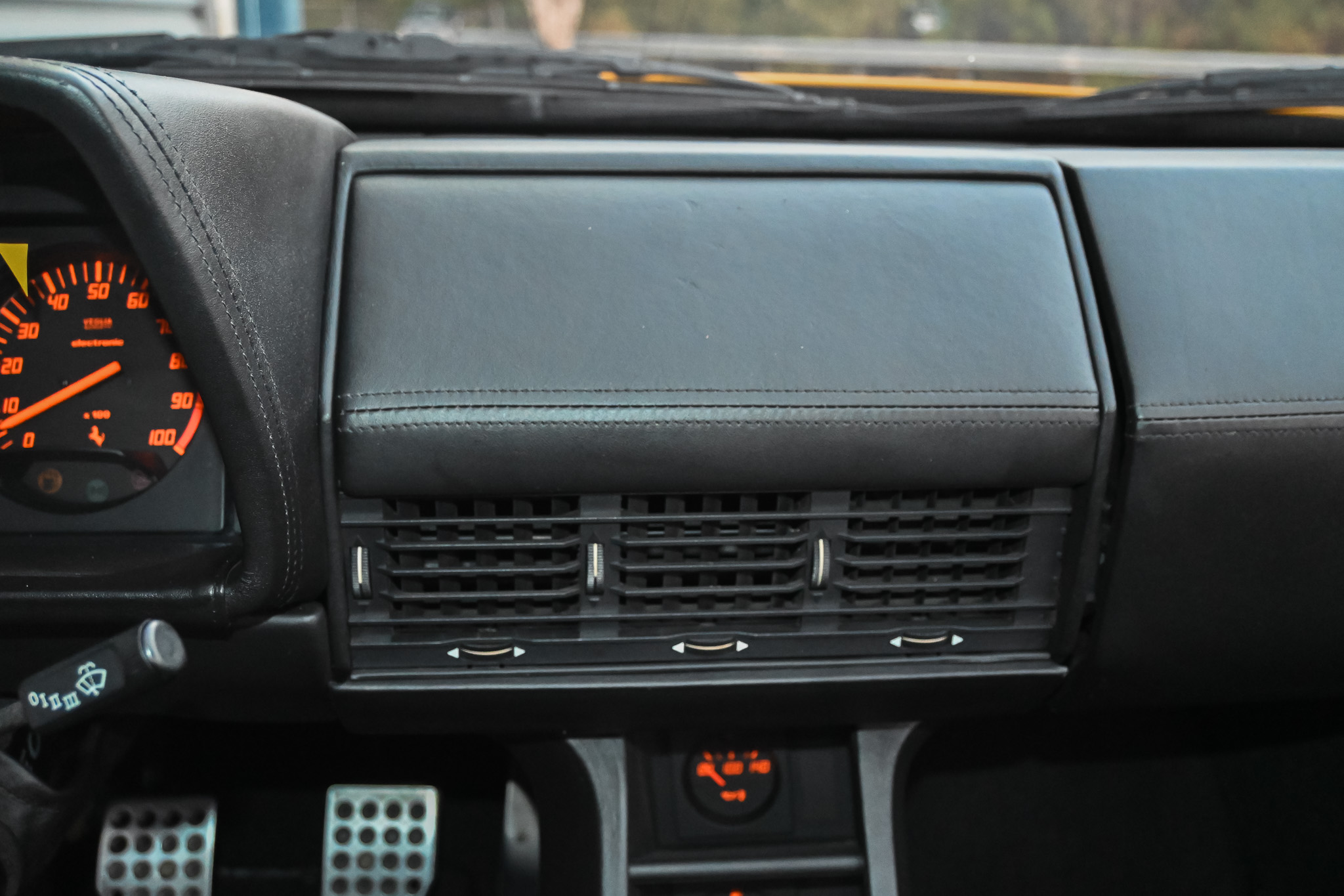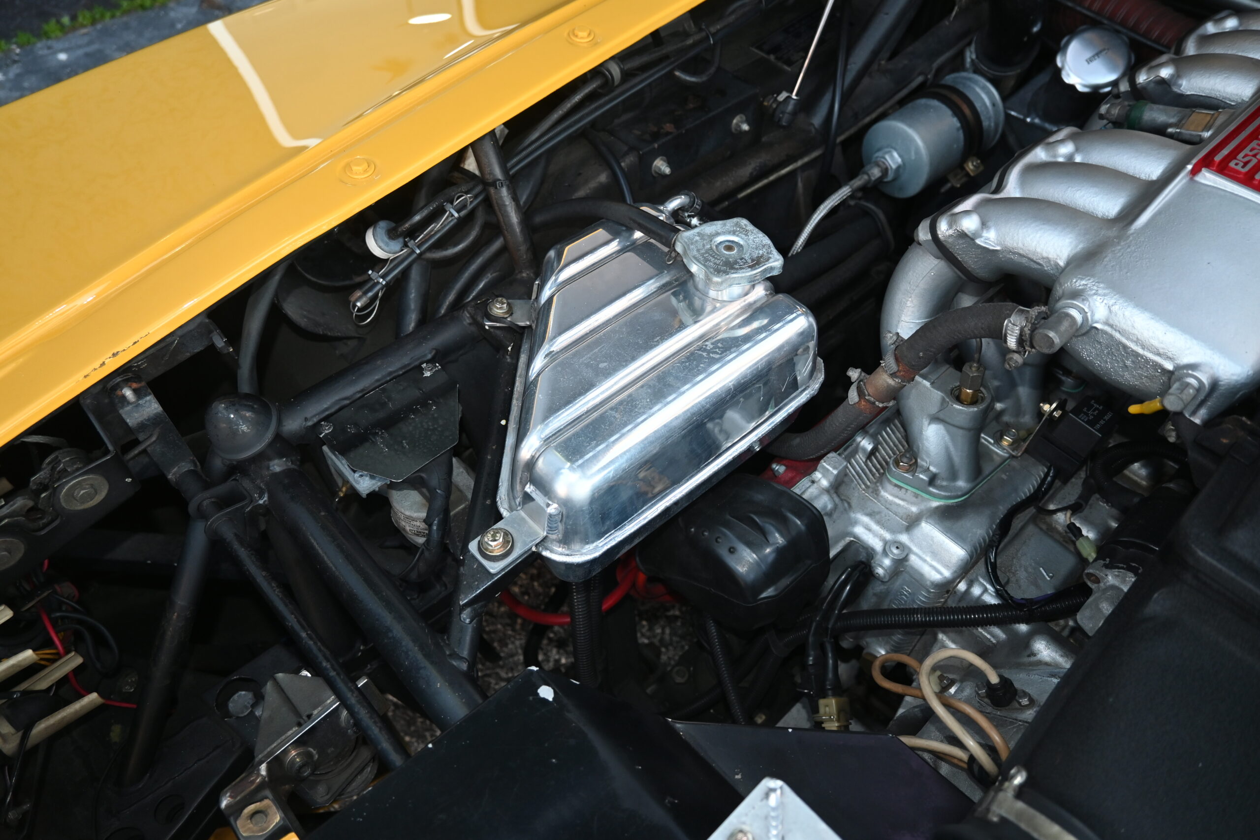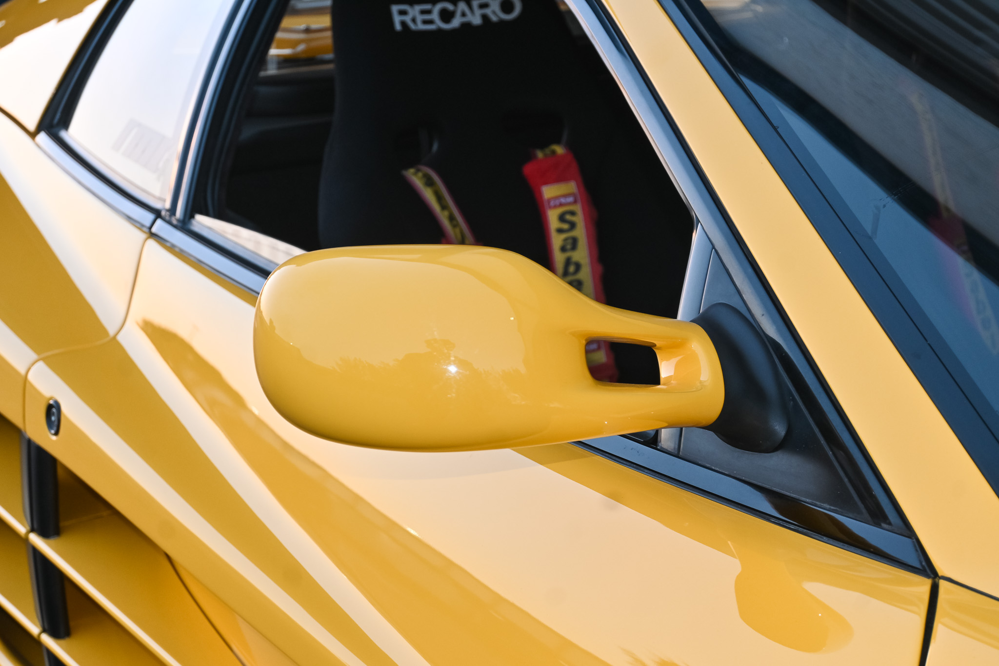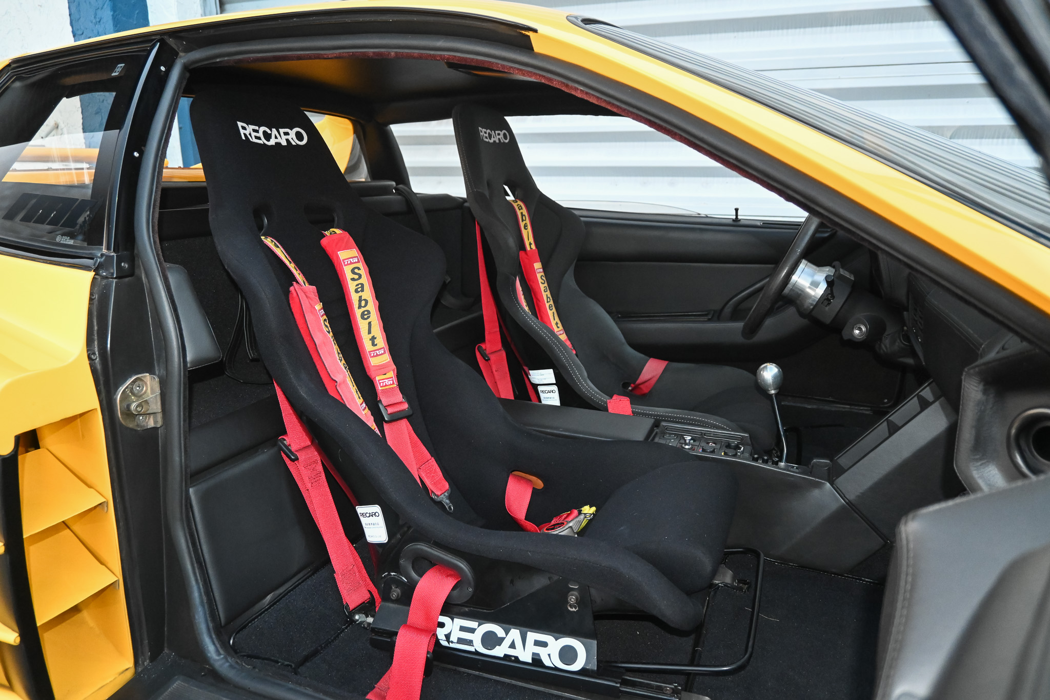 Moving to the interior, the original light beige seats, carpeting and headliner has been removed and replaced with all black to better match the Giallo exterior. To compliment the new black trim, two matching Recaro fixed buckets were added with vintage 4-point Sabelt harnesses. The black dash leather shows good condition along with the matching door cards. Latches for the front boot and engine compartment work perfectly and the rear compartment is supported by pins on both sides. A polished shifter and 3XXmm Imola black leather steering wheel finish off the driver-focused interior motive.