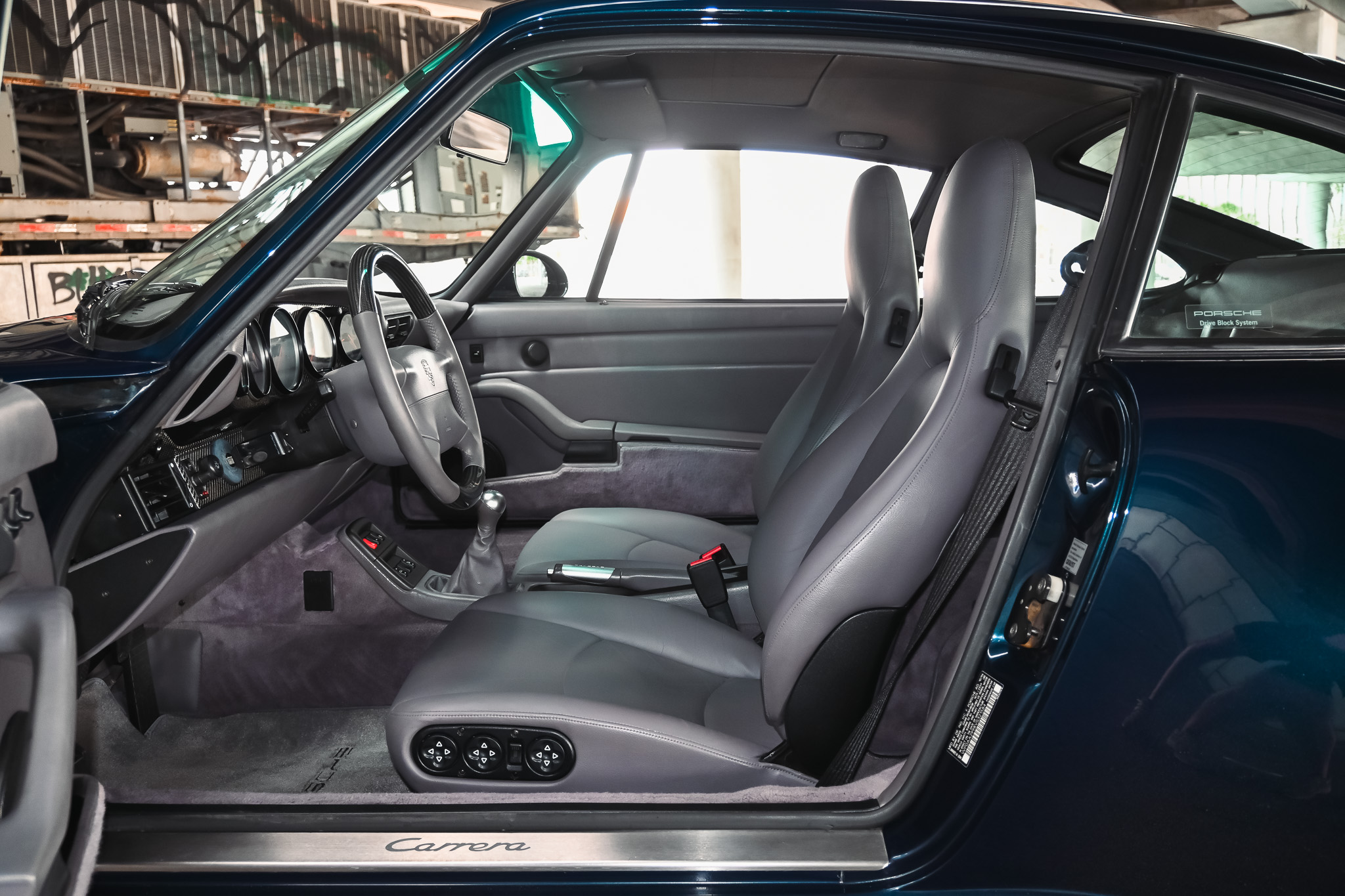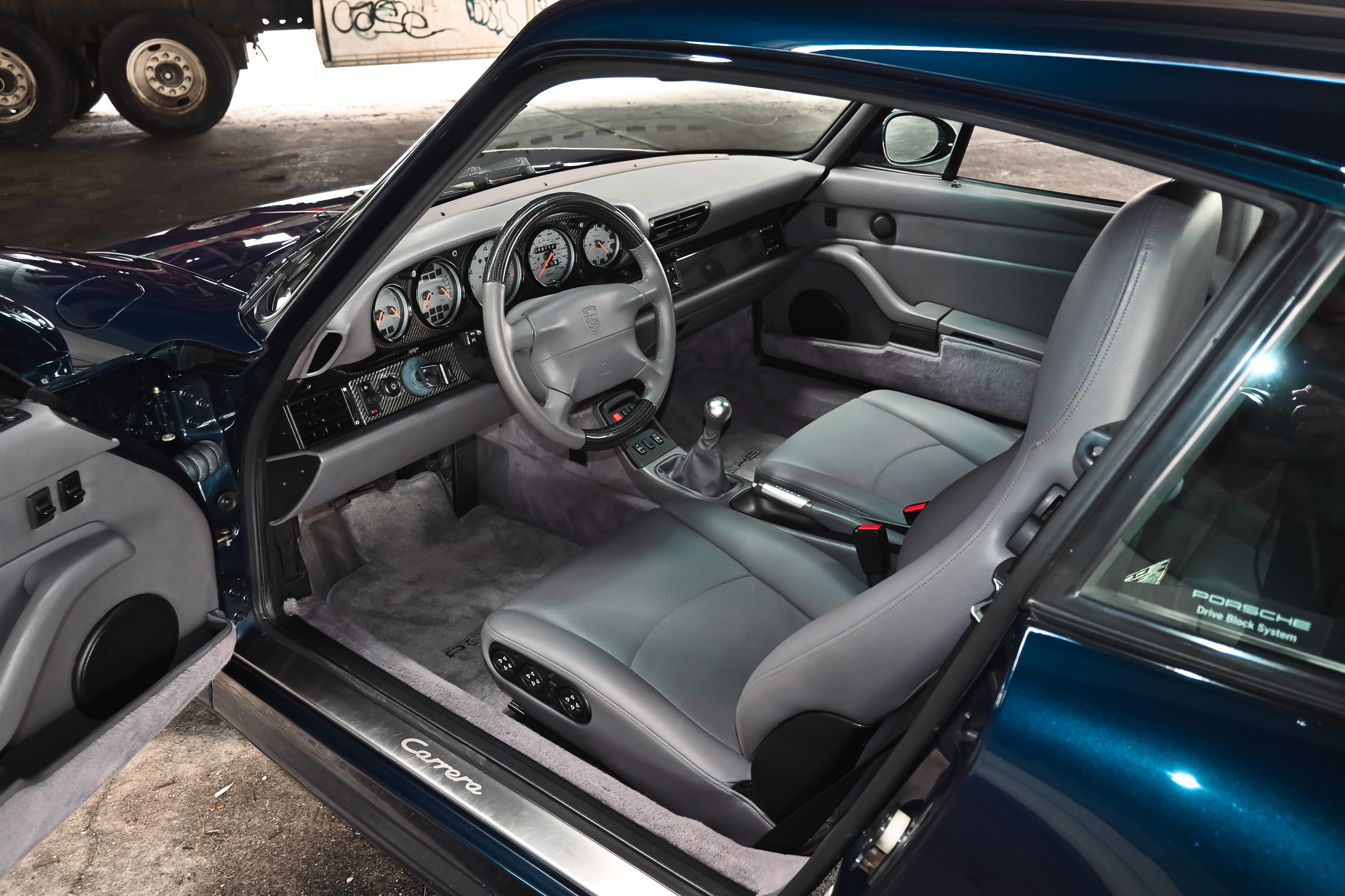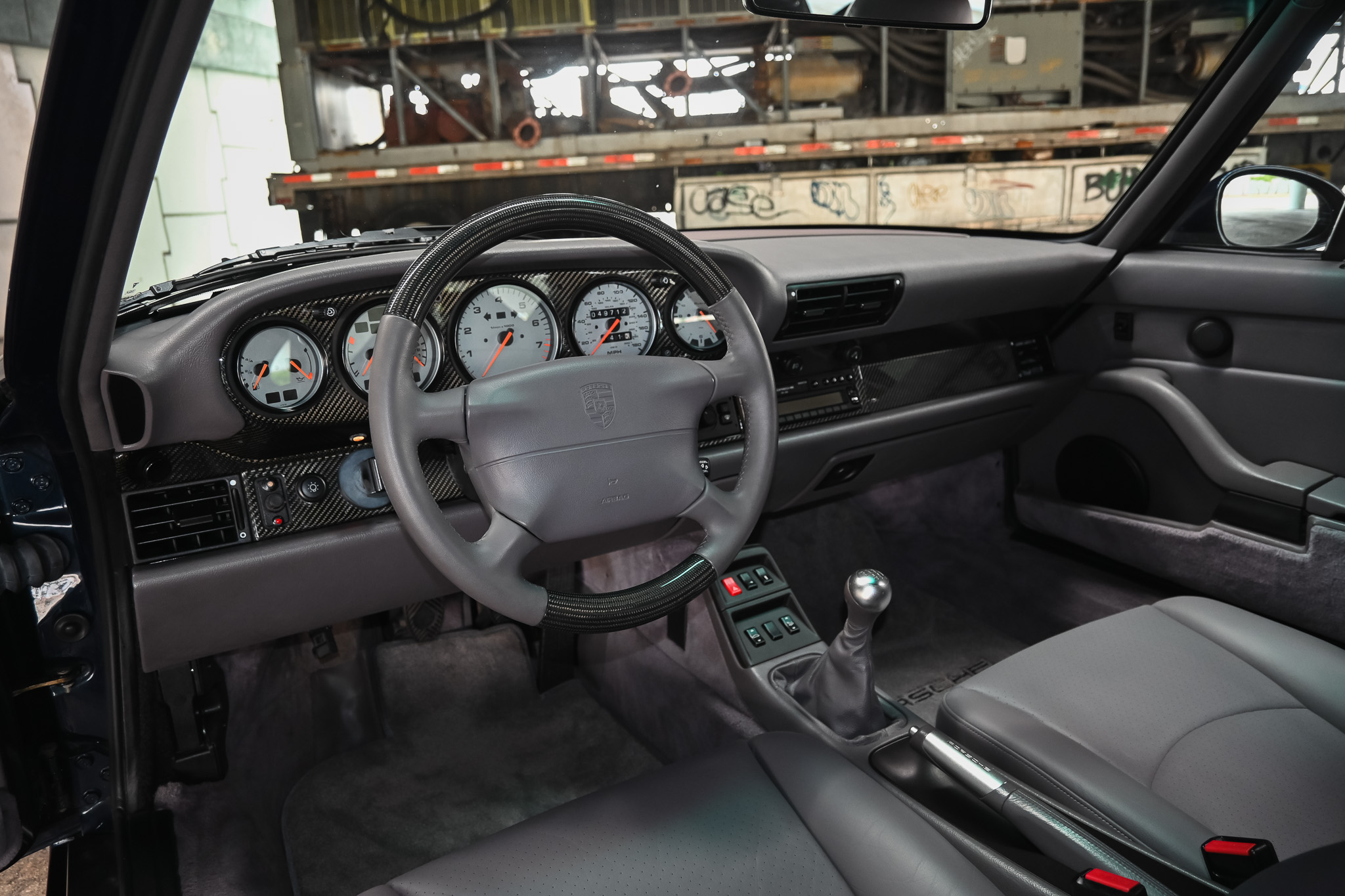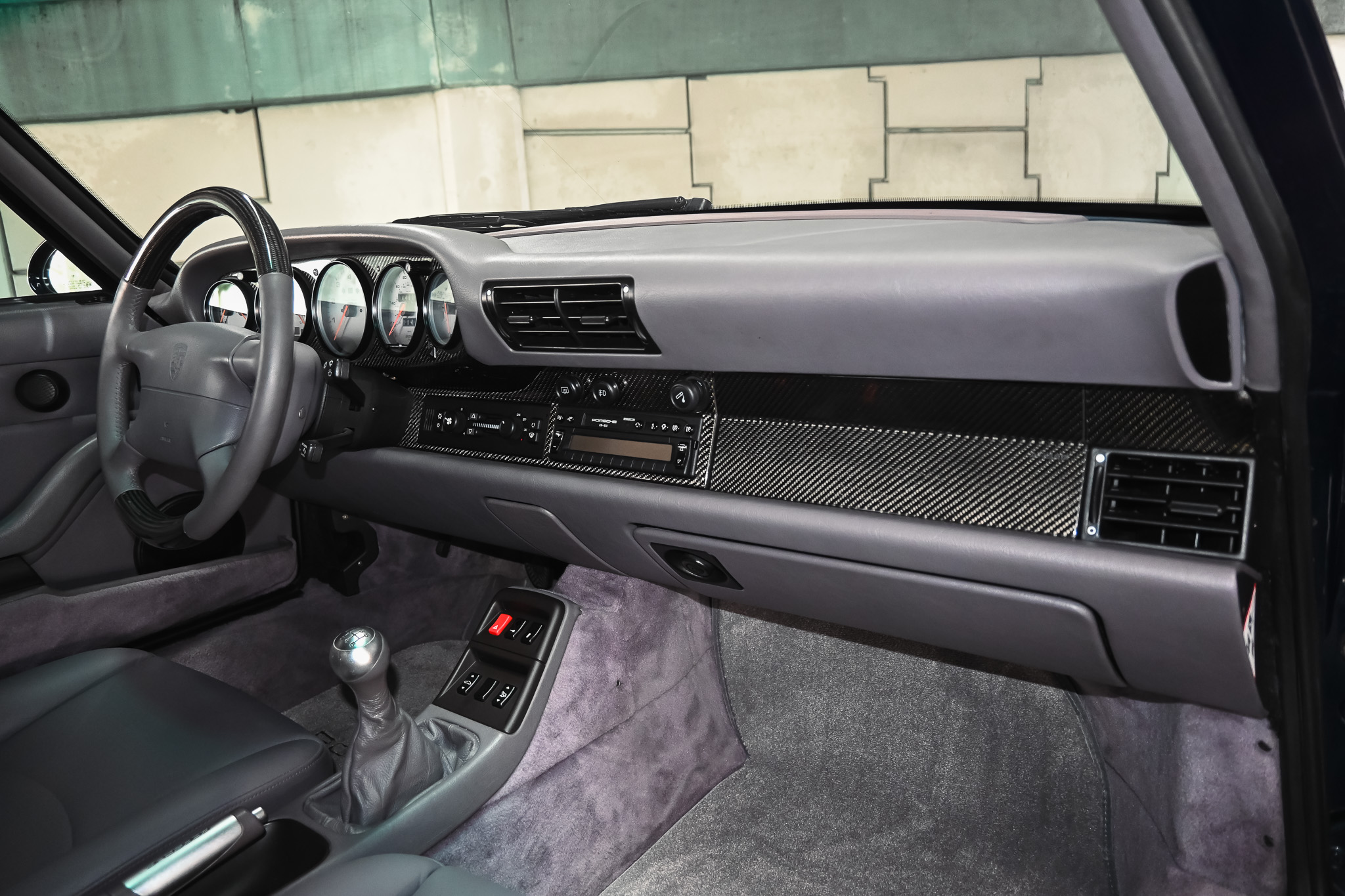 The interior is finished in Classic Grey – a subtle finish that contrasts well with the blue exterior. The front seats present little to no wear and tear along with the dash and interior touch points. This example is still outfitted with the factory Porsche radio. However, the standout feature is the OEM, dealer-installed (not shown on the build sheet) carbon fiber dash trim and steering wheel – an extremely rare option on non-turbo models.